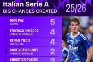 全文摘要:截至2025/26赛季意甲,科莫球员尼科-帕斯以5次创造重大机会位列榜首。国际米兰的迪马尔科与尤文图斯的伊尔迪兹以4次次席。国际米兰共有三名球员进入前十,展现了强大的进攻创造力。