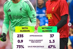 全文摘要:英超利物浦将战切尔西。主力门将阿利森伤缺,预计玛玛达什维利顶替。数据显示,阿利森缺阵时,利物浦场均丢球增至1.3个,扑救成功率降至67%,赢球率也下滑至73%。