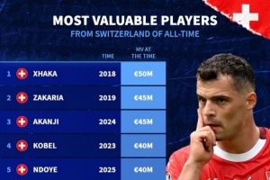 全文摘要:德国转会市场公布了瑞士球员历史最高身价排行榜。扎卡以2018年的5000万欧身价位居榜首。扎卡里亚(4500万欧)和阿坎吉(4500万欧)分列二、三位,科贝尔(4000万欧)和恩多耶(4000万欧)紧随其后,展现了瑞士球员近年来的市场价值。