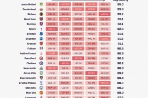 OPTA为各队未来5轮联赛的困难程度进行了量化打分,利兹联赛程95.0分最困难,桑德兰(93.6分)、狼队(93.2分)、西汉姆(93.1分)、伯恩利(92.1分)分列二到五位。