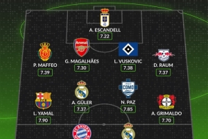 中场/边锋:亚马尔(巴萨)、居莱尔(皇马)、帕斯(科莫)、格里马尔多(勒沃库森)