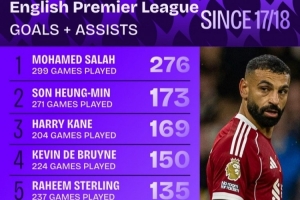 全文摘要:根据Squakwa数据,自17-18赛季以来,英超直接参与进球榜萨拉赫以299场276球断崖式领跑。孙兴慜(173球)、凯恩(169球)分列二、三位,德布劳内、斯特林等球员也跻身前十。